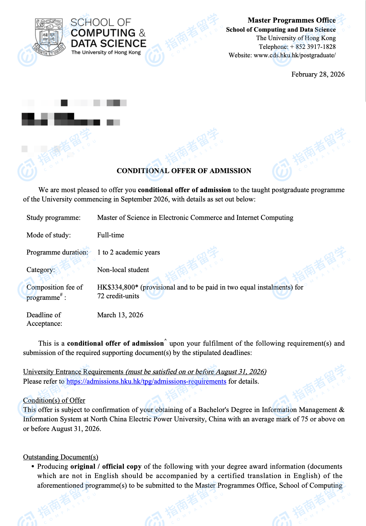 香港大学电子商贸及互联网工程理学硕士研究生offer一枚