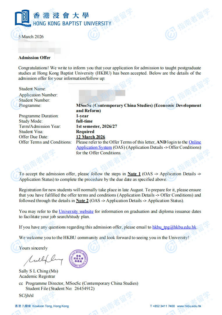 香港浸会大学当代中国研究社会科学硕士研究生offer一枚