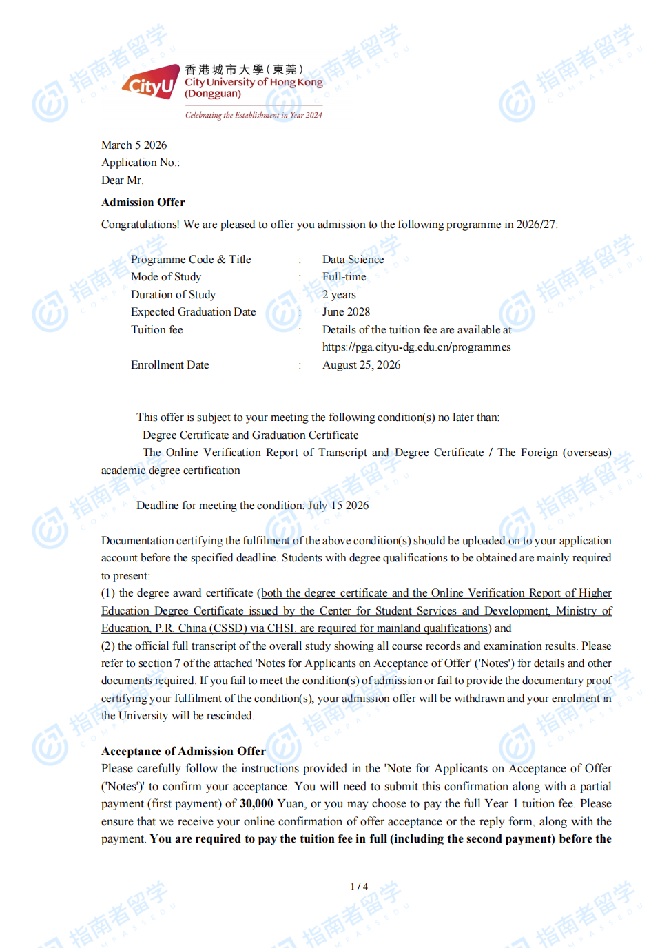 香港城市大学数据科学理学硕士(CityU-DG)研究生offer一枚