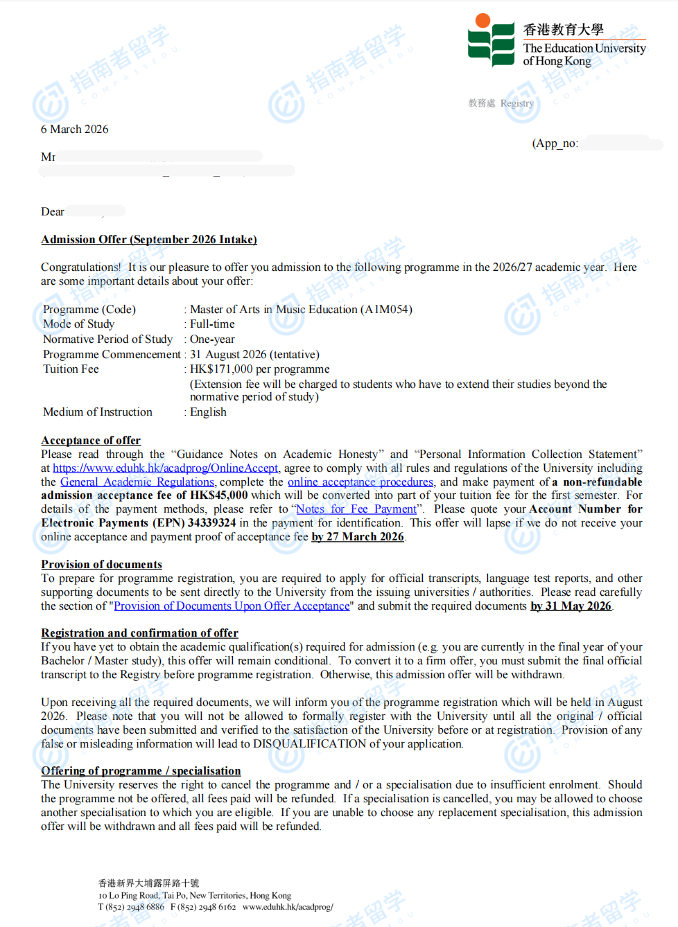 香港教育大学音乐教育文学硕士研究生offer一枚