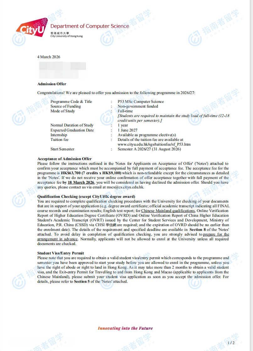香港城市大学计算机科学理学硕士研究生offer一枚