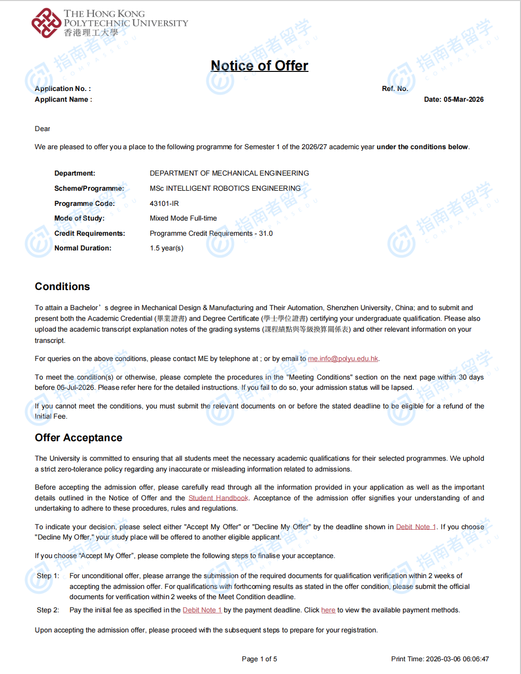 香港理工大学智能机器人工程理学硕士研究生offer一枚