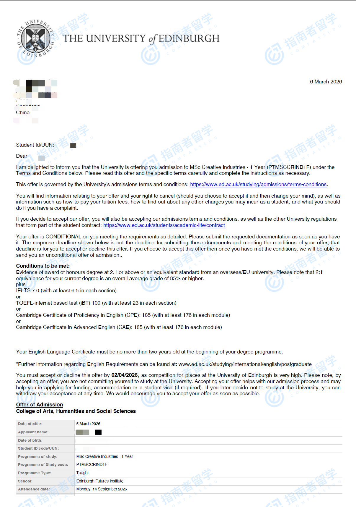爱丁堡大学创意产业理学硕士研究生offer一枚