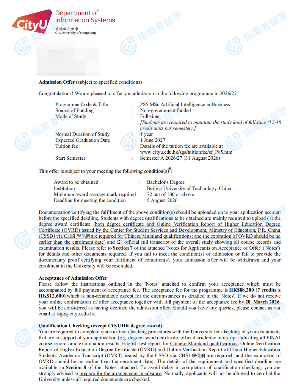 香港城市大学商业人工智能理学硕士研究生offer一枚