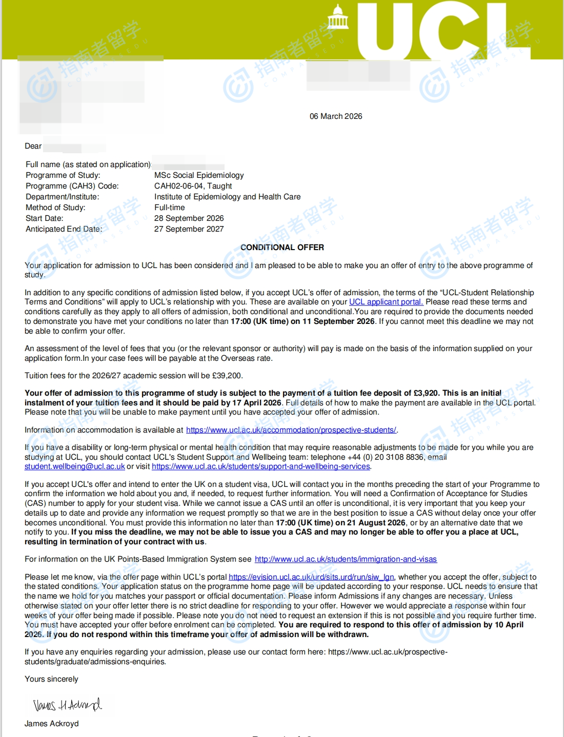 伦敦大学学院社会流行病学理学硕士研究生offer一枚