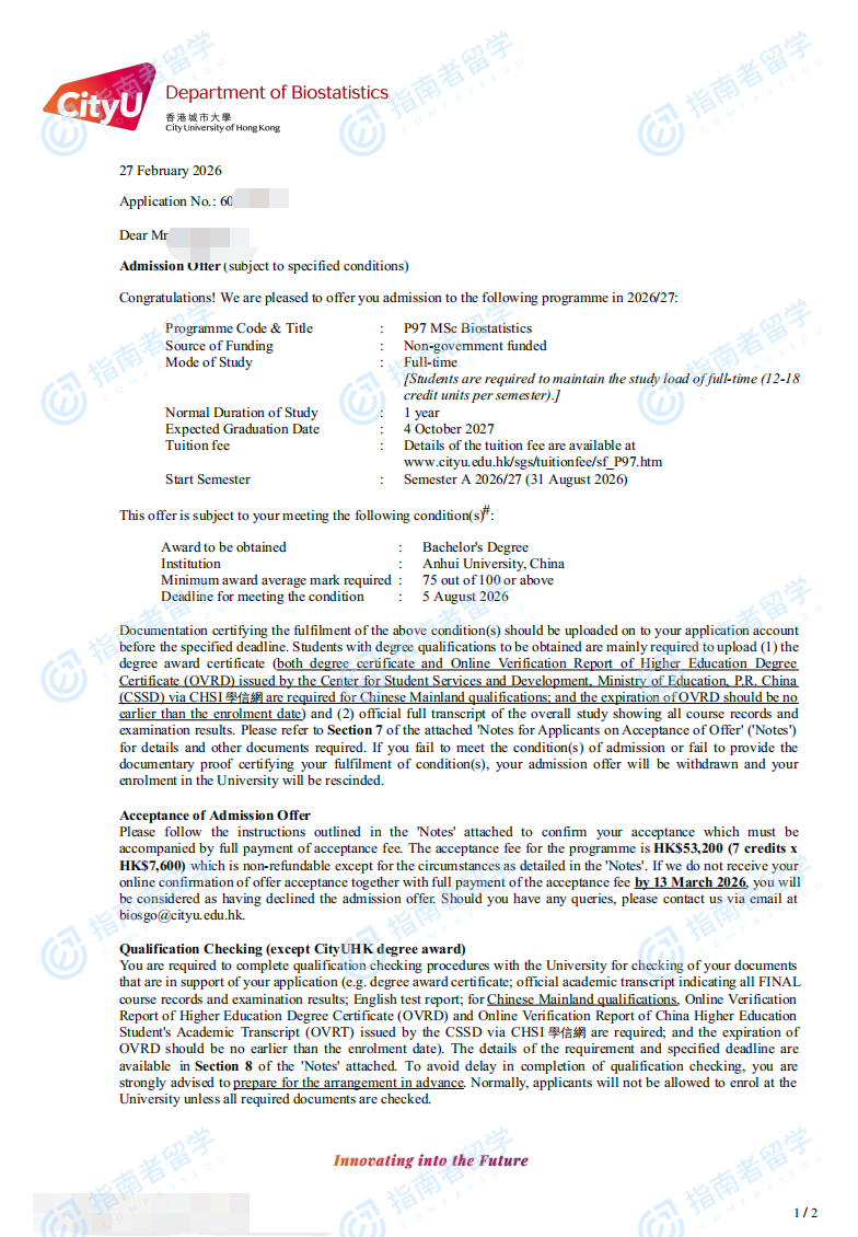 香港城市大学生物统计学理学硕士研究生offer一枚