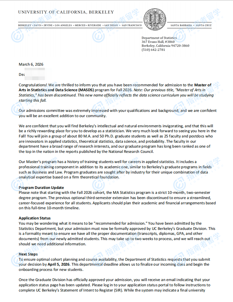 加州大学伯克利分校统计学硕士研究生offer一枚