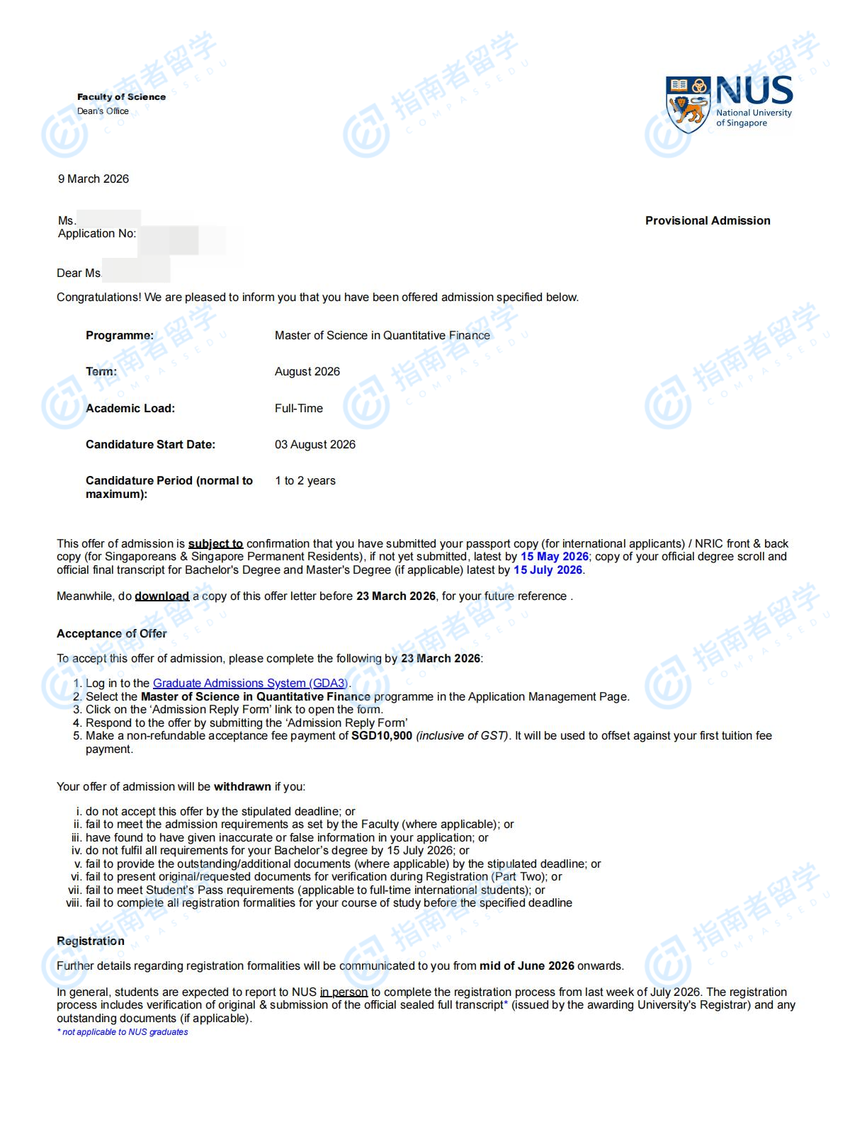 新加坡国立大学定量金融理学硕士研究生offer一枚