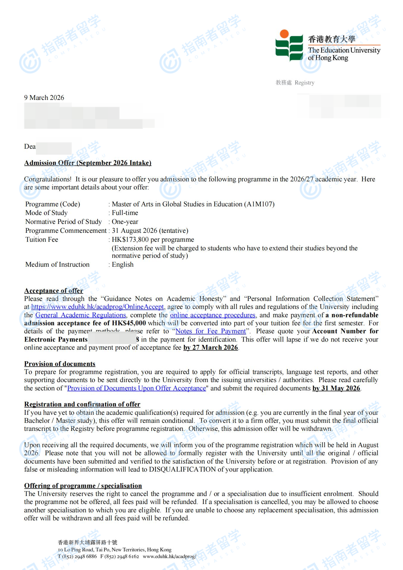 香港教育大学全球教育研究文学硕士研究生offer一枚
