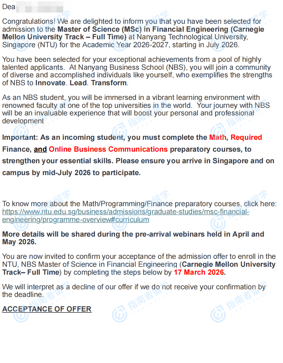 南洋理工大学金融工程理学硕士研究生offer一枚