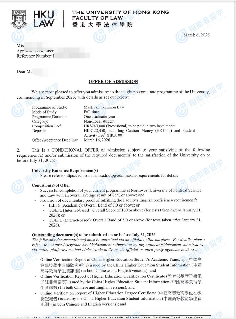香港大学普通法硕士研究生offer一枚