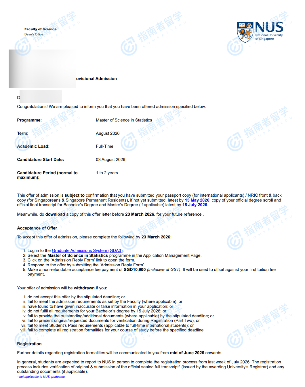 新加坡国立大学统计学理学硕士研究生offer一枚