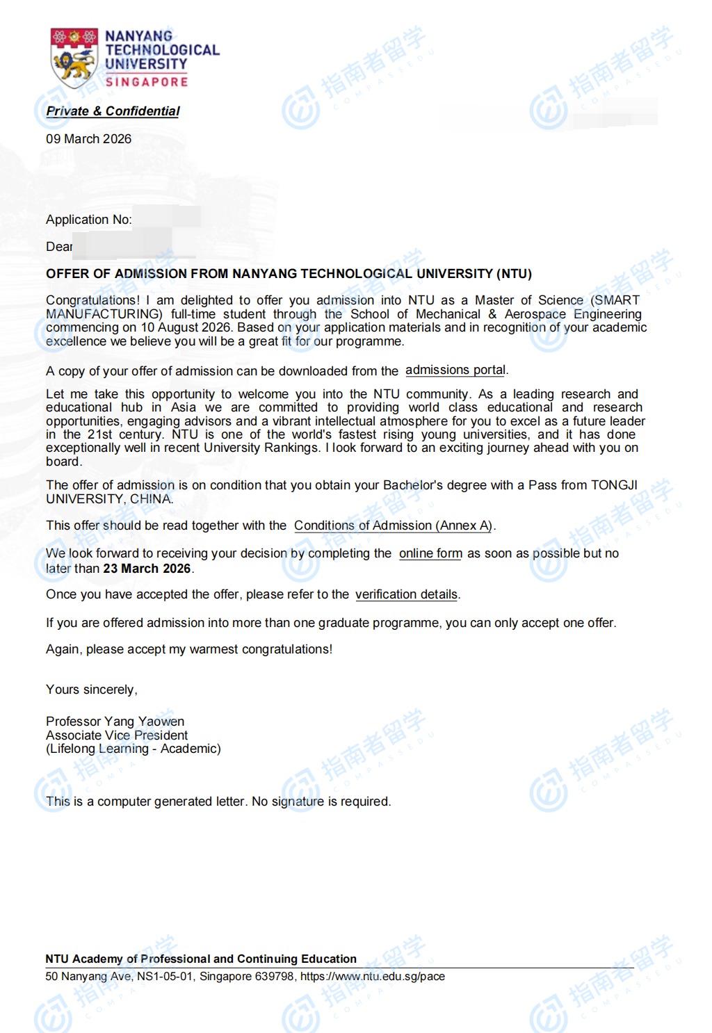 南洋理工大学智能制造理学硕士研究生offer一枚