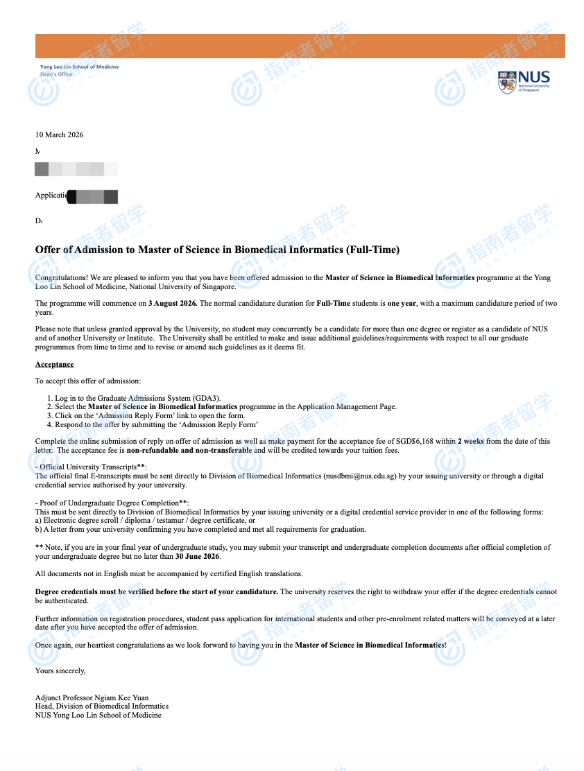 新加坡国立大学生物医学信息学理学硕士研究生offer一枚
