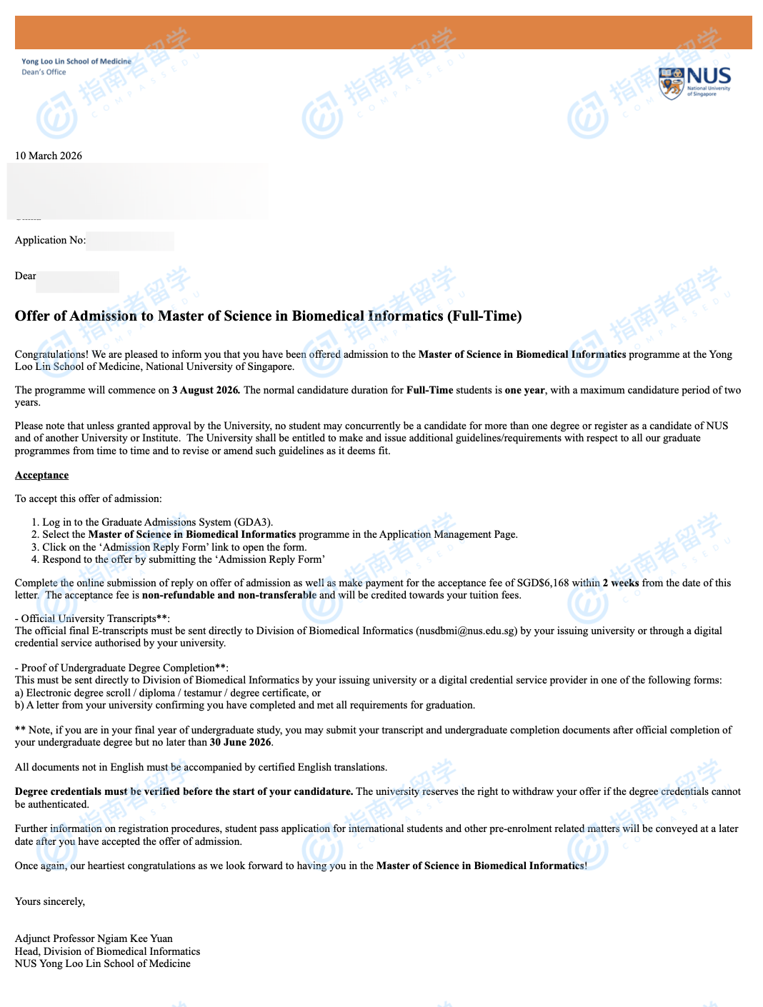 新加坡国立大学生物医学信息学理学硕士研究生offer一枚