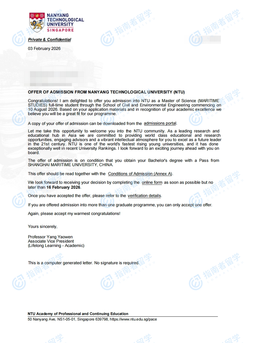南洋理工大学海事研究理学硕士研究生offer一枚