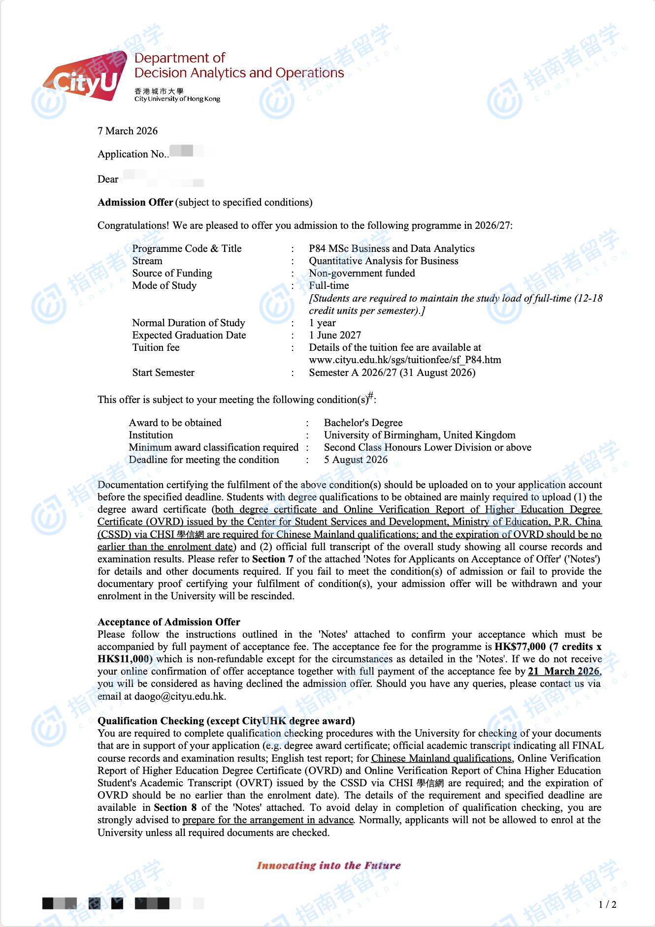 香港城市大学商业及数据分析理学硕士研究生offer一枚
