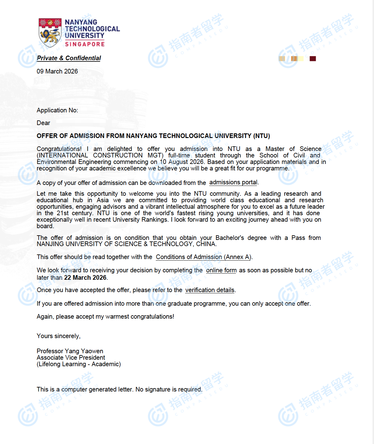 南洋理工大学国际建筑管理理学硕士研究生offer一枚