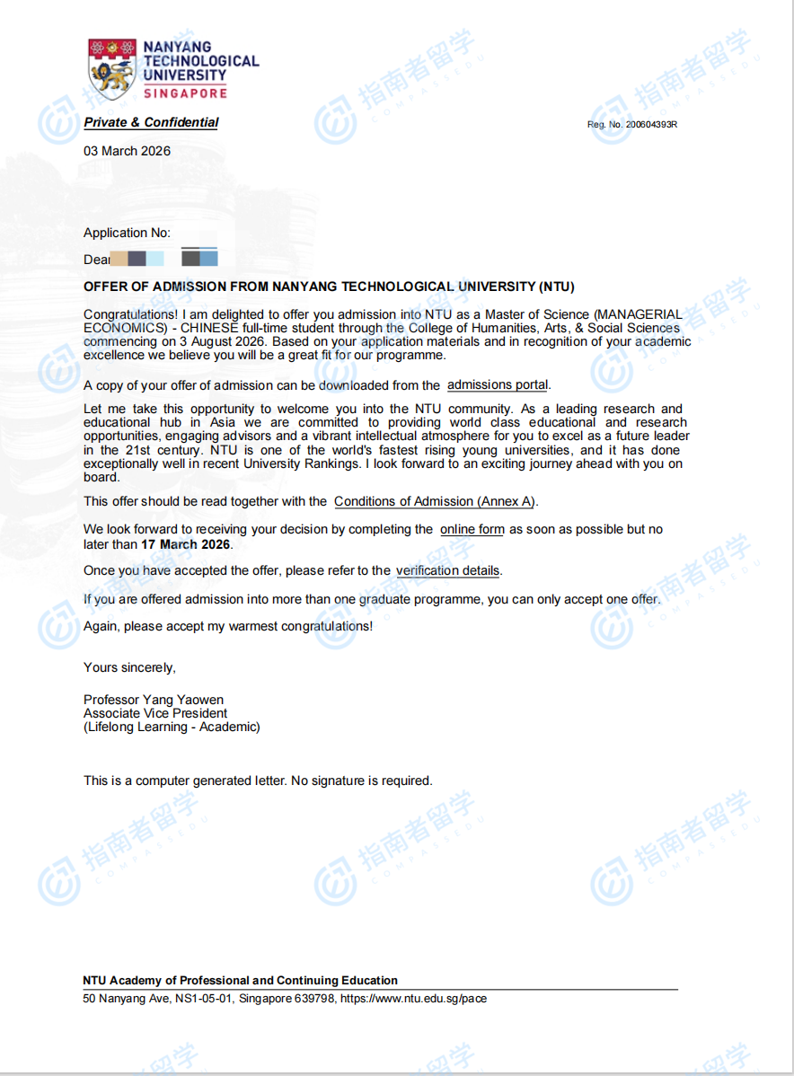 南洋理工大学管理经济学理学硕士(中文授课)研究生offer一枚