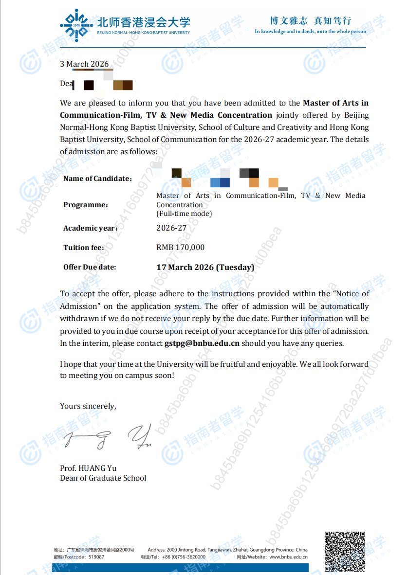 香港浸会大学传播学文学硕士 影视与新媒体制片管理专修(北师港浸大)研究生offer一枚