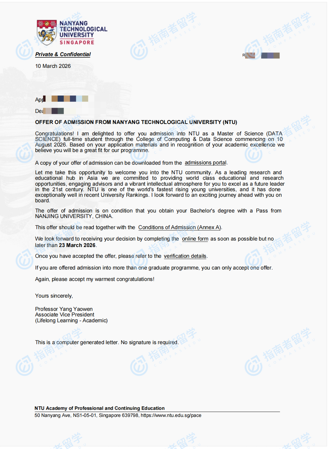 南洋理工大学数据科学理学硕士研究生offer一枚