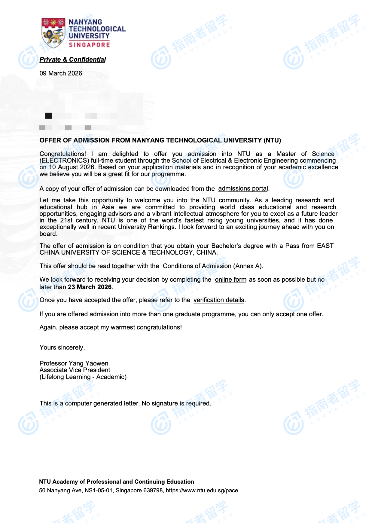 南洋理工大学电子学理学硕士研究生offer一枚