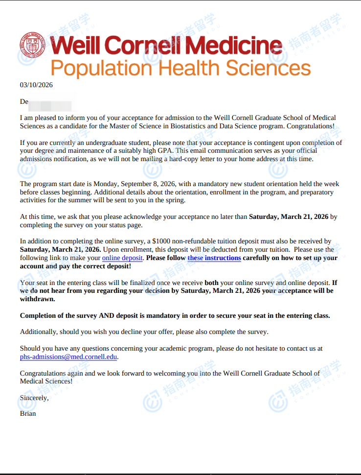 康奈尔大学生物统计学与数据科学硕士研究生offer一枚