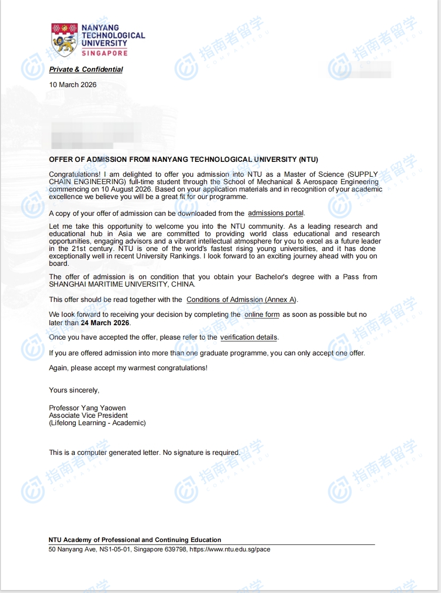 南洋理工大学供应链工程理学硕士研究生offer一枚
