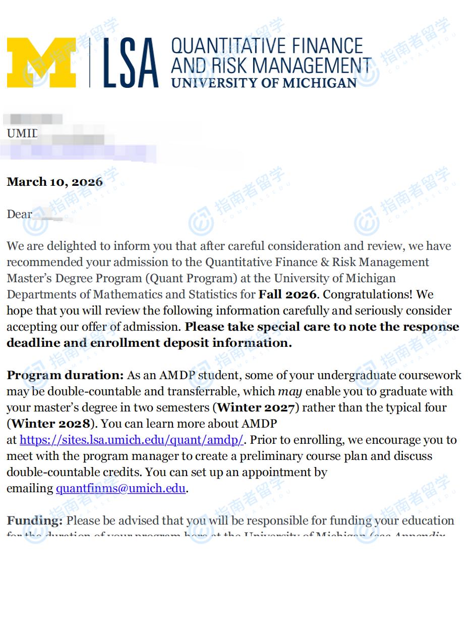 密歇根大学安娜堡分校定量金融与风险管理硕士研究生offer一枚