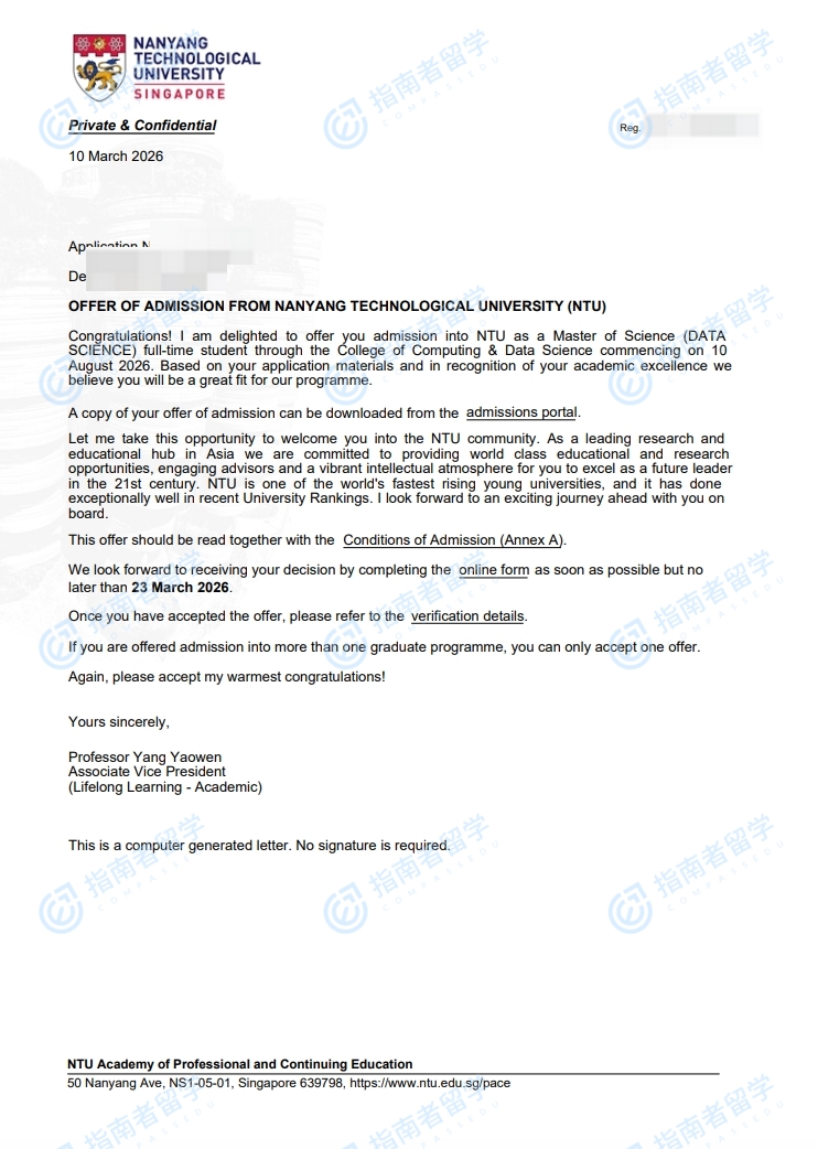 南洋理工大学数据科学理学硕士研究生offer一枚