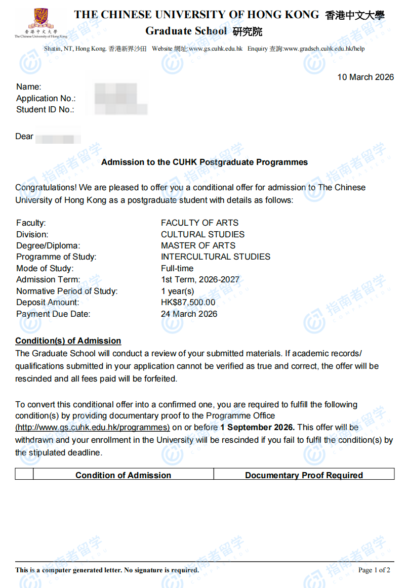 香港中文大学跨文化研究文学硕士研究生offer一枚