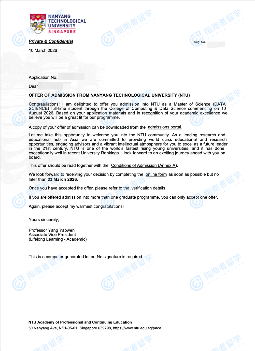 南洋理工大学数据科学理学硕士研究生offer一枚