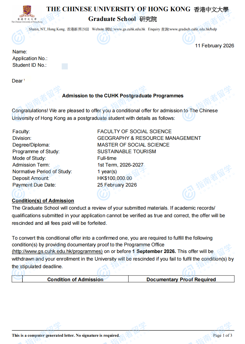 香港中文大学可持续旅游管理社会科学硕士研究生offer一枚