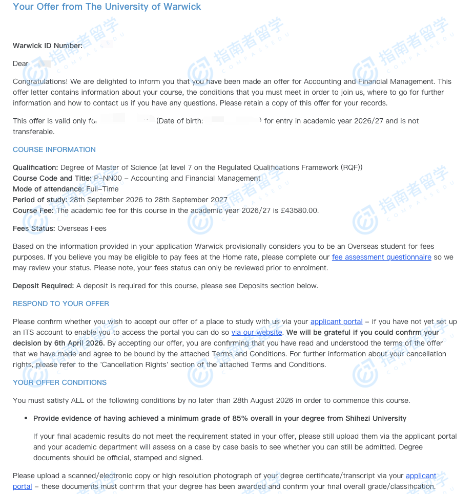 华威大学会计与财务管理理学硕士研究生offer一枚