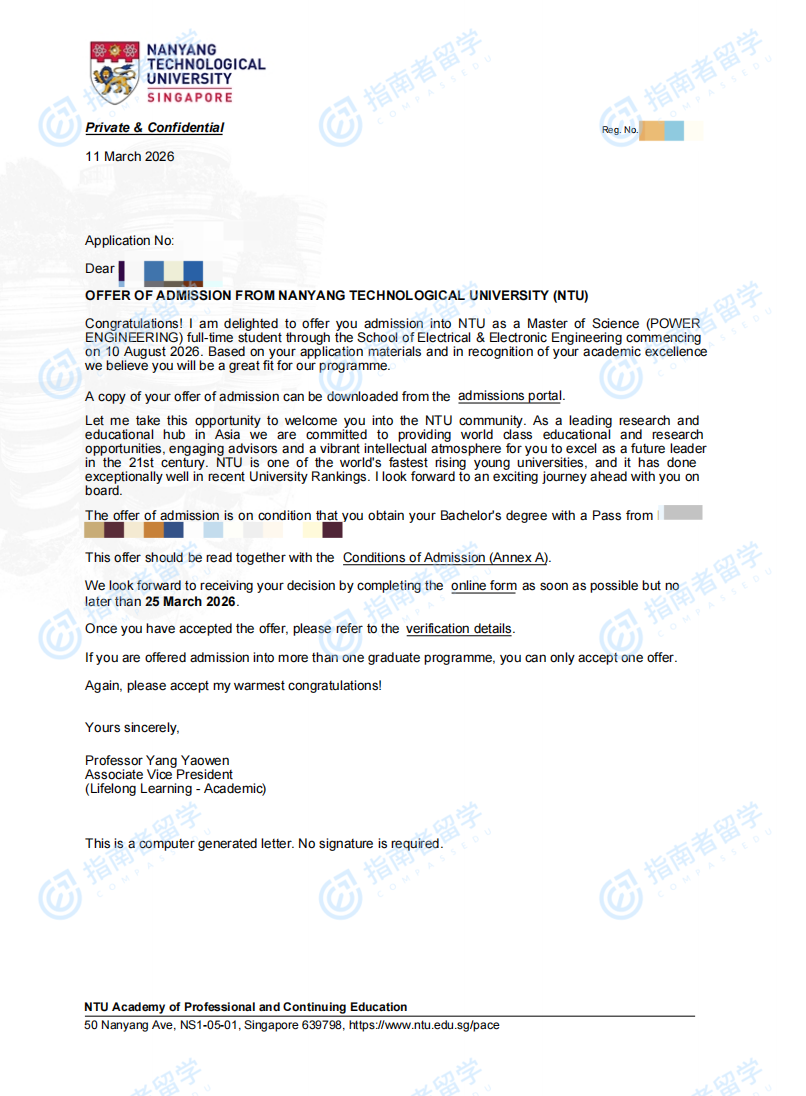 南洋理工大学电力工程理学硕士研究生offer一枚
