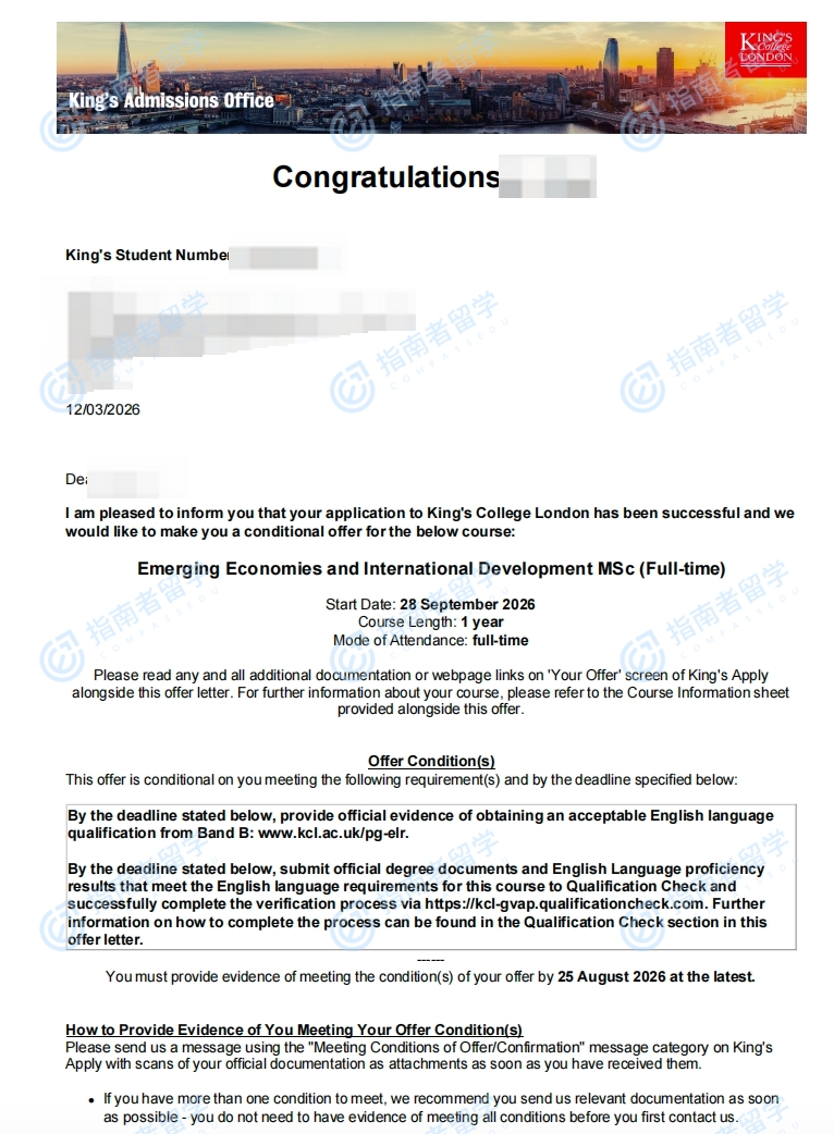 伦敦大学国王学院新兴经济体与国际发展理学硕士研究生offer一枚