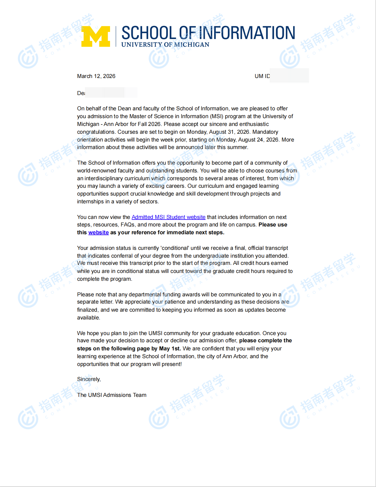 密歇根大学安娜堡分校信息学硕士研究生offer一枚