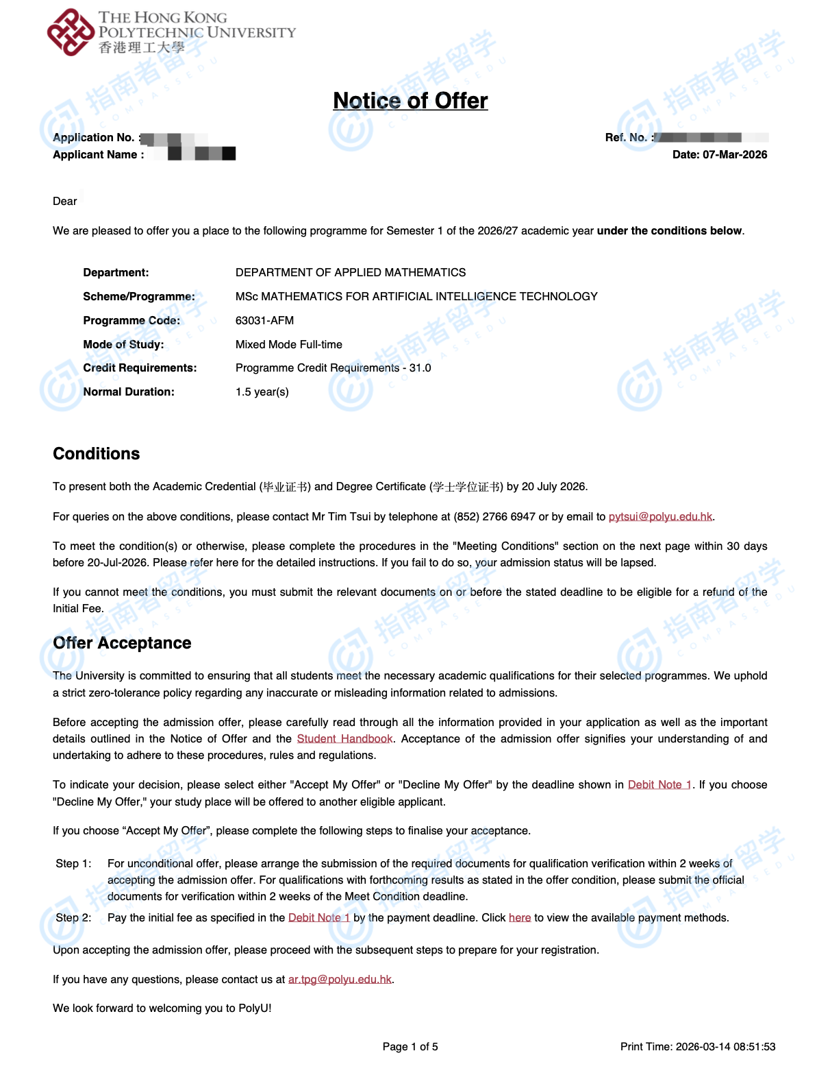 香港理工大学人工智能技术数学理学硕士研究生offer一枚