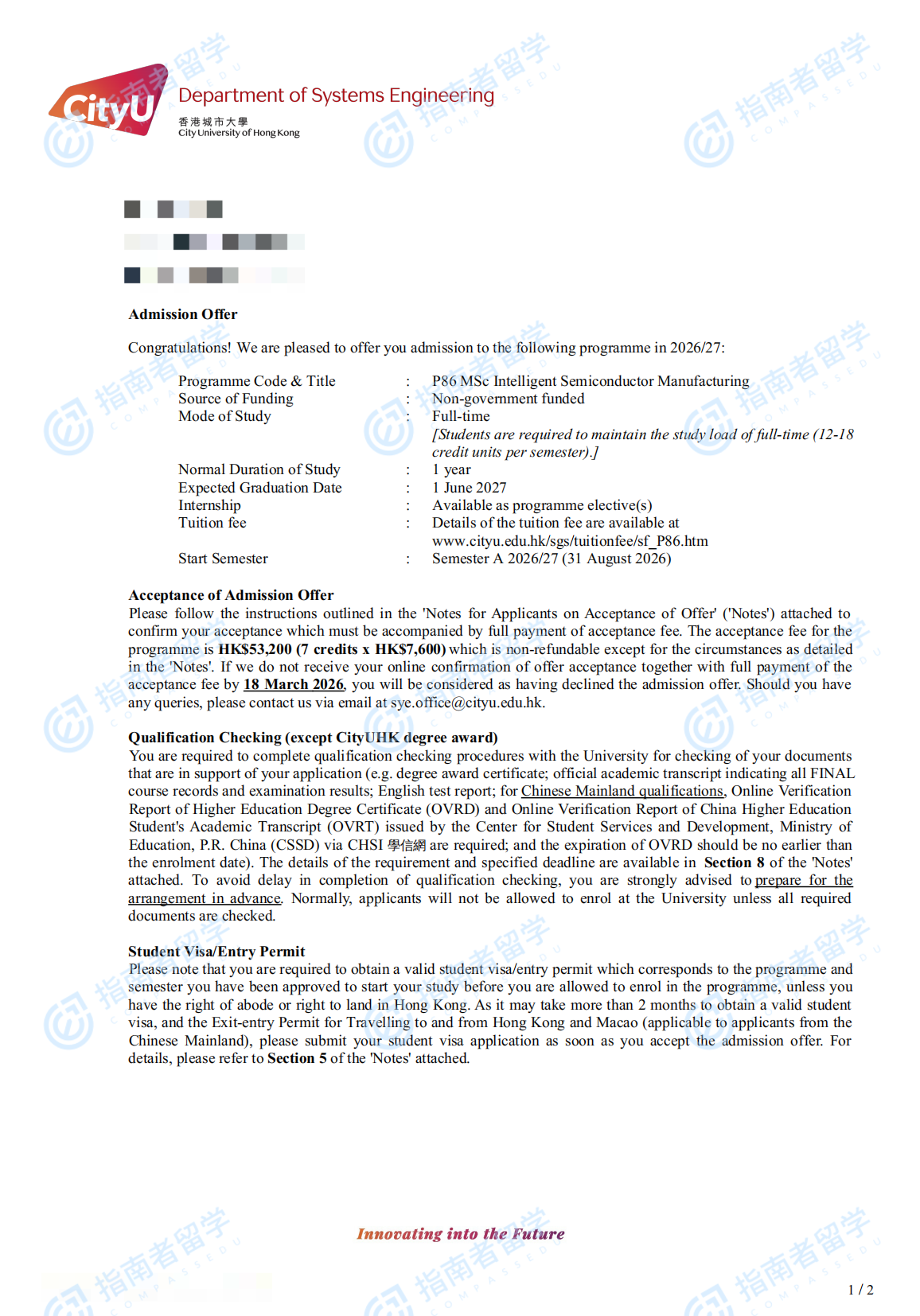 香港城市大学智能半导体制造理学硕士研究生offer一枚