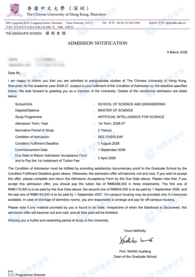 <p>香港中文大学(深圳)理工学院人工智能(科学应用)理学硕士项目 (MSc. AIS) 是围绕人工智能与前沿自然科学及工程的交叉领域开设的为期两年的全日制硕士项目,旨在培养兼具人工智能技能与相关科学素养的跨学科复合型创新人才。项目课程涵盖人工智能、数学、物理、化学、材料、新能源与工程、机器人等多个学科知识,突出跨学科融合,并以前沿科研为驱动。学生将系统学习人工智能核心方法,包括机器学习、深度学习、生成式模型以及科学计算,并通过跨学科以及实际科研项目深入接触和理解其在前沿科学问题中的应用。</p>
