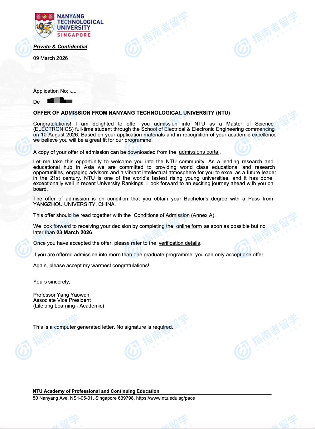 南洋理工大学电子学理学硕士研究生offer一枚