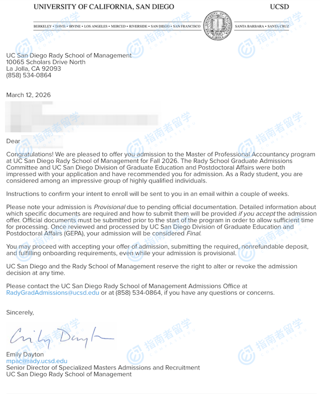 加州大学圣地亚哥分校专业会计硕士研究生offer一枚