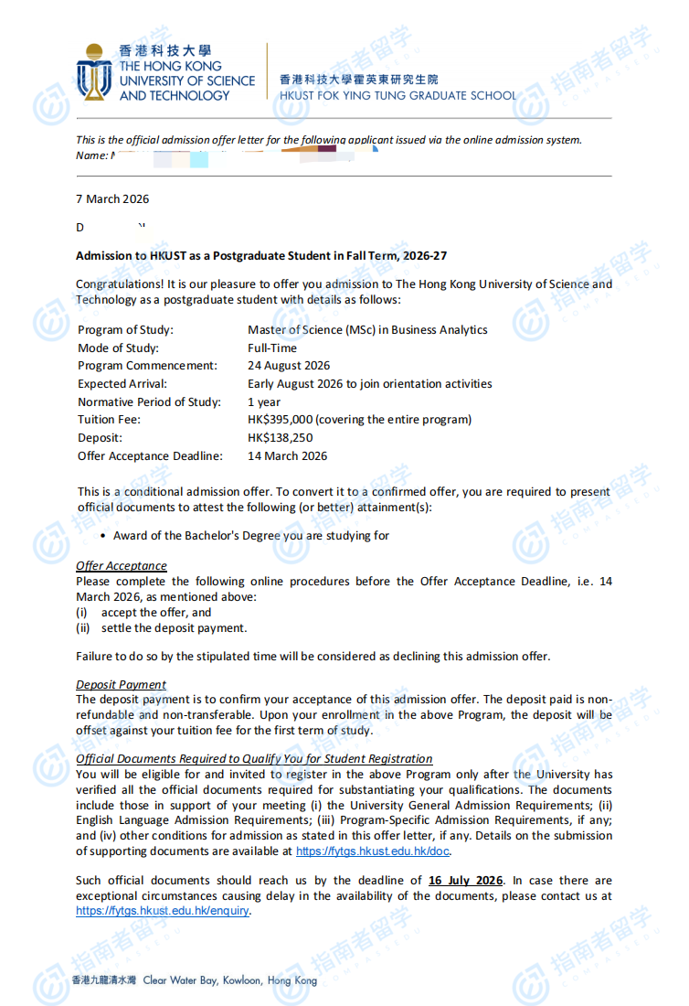 香港科技大学商业分析理学硕士研究生offer一枚