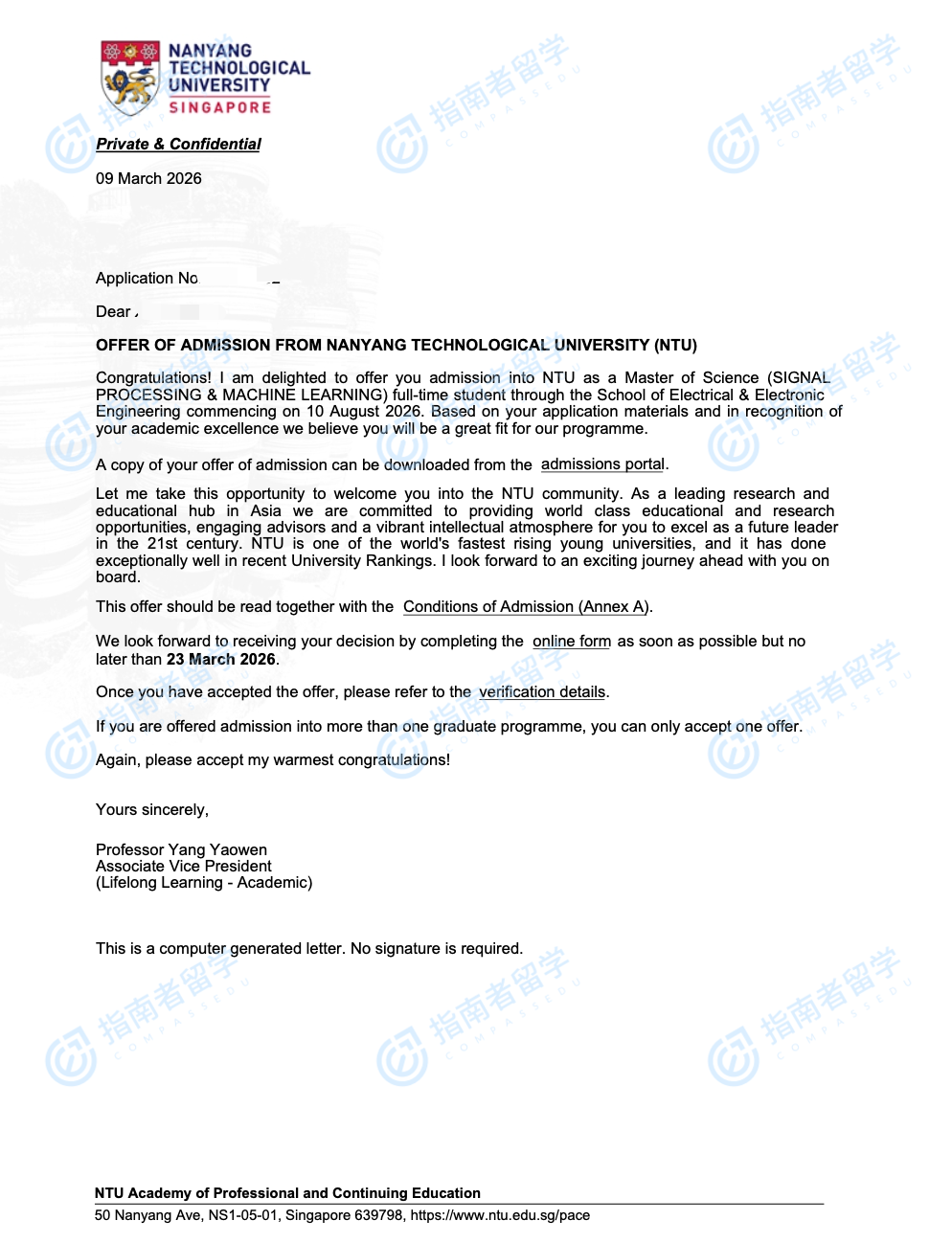 南洋理工大学信号处理和机器学习理学硕士研究生offer一枚