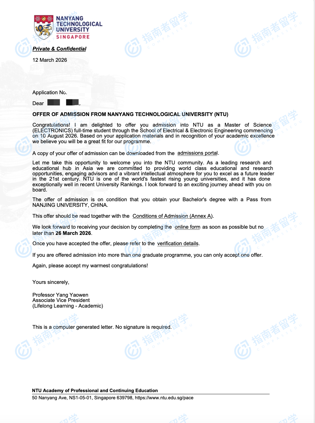 南洋理工大学电子工程方向录取报告