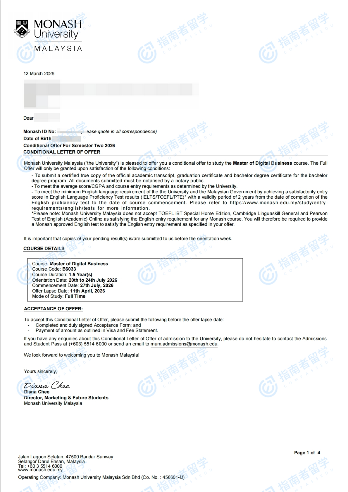 马来西亚莫纳什大学数字商务硕士研究生offer一枚