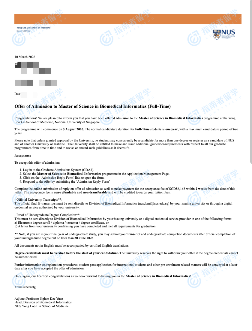 新加坡国立大学生物医学信息学理学硕士研究生offer一枚