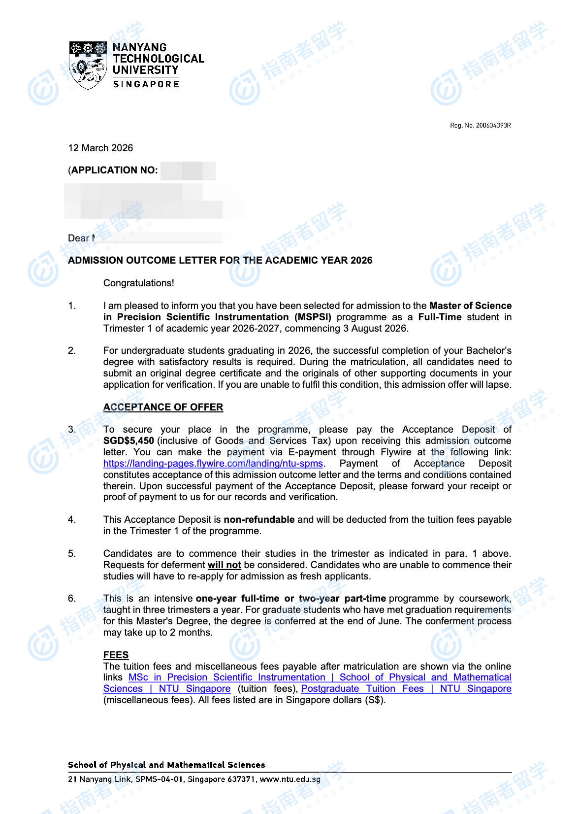 南洋理工大学精密科学仪器理学硕士研究生offer一枚