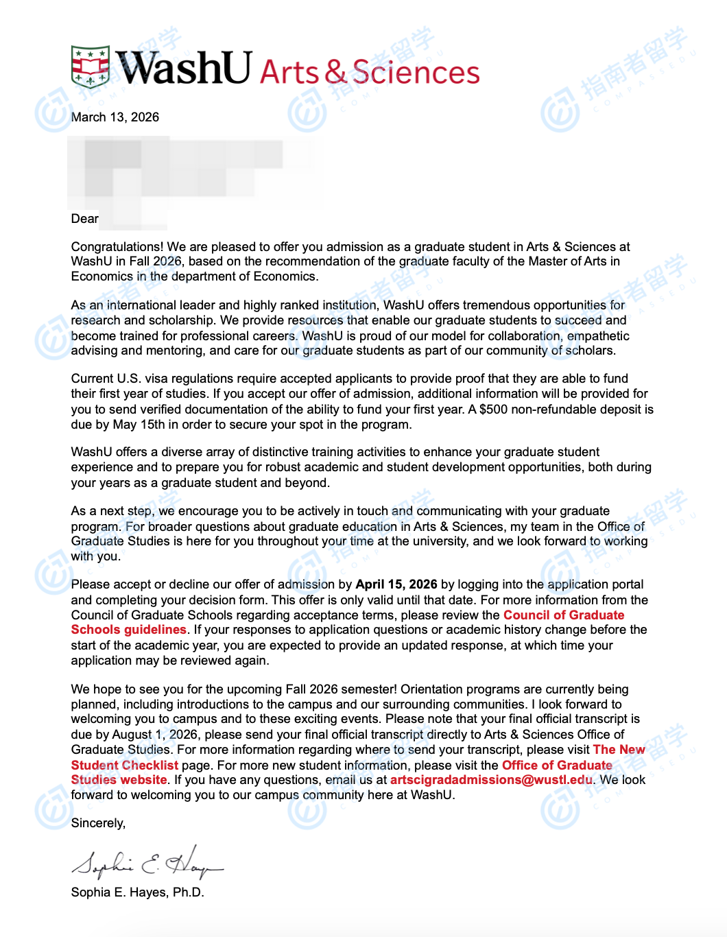 圣路易斯华盛顿大学经济学硕士研究生offer一枚