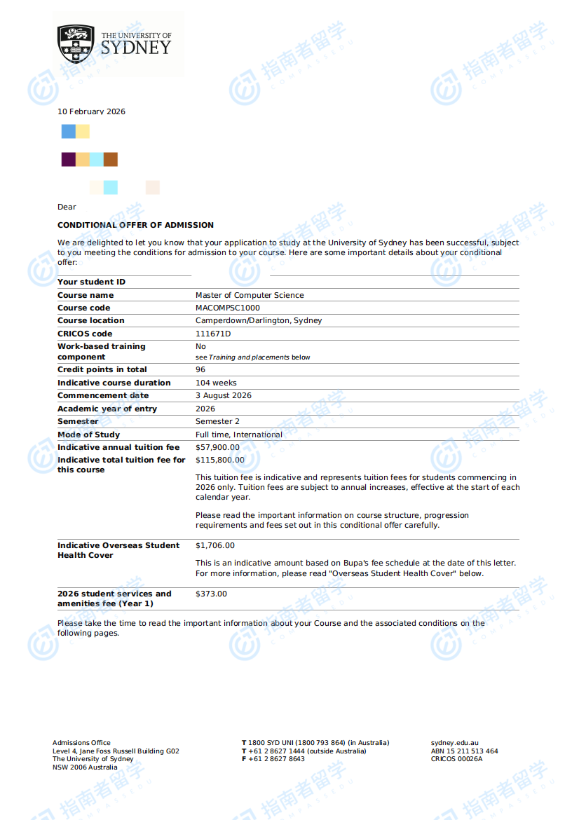 悉尼大学计算机科学硕士研究生offer一枚